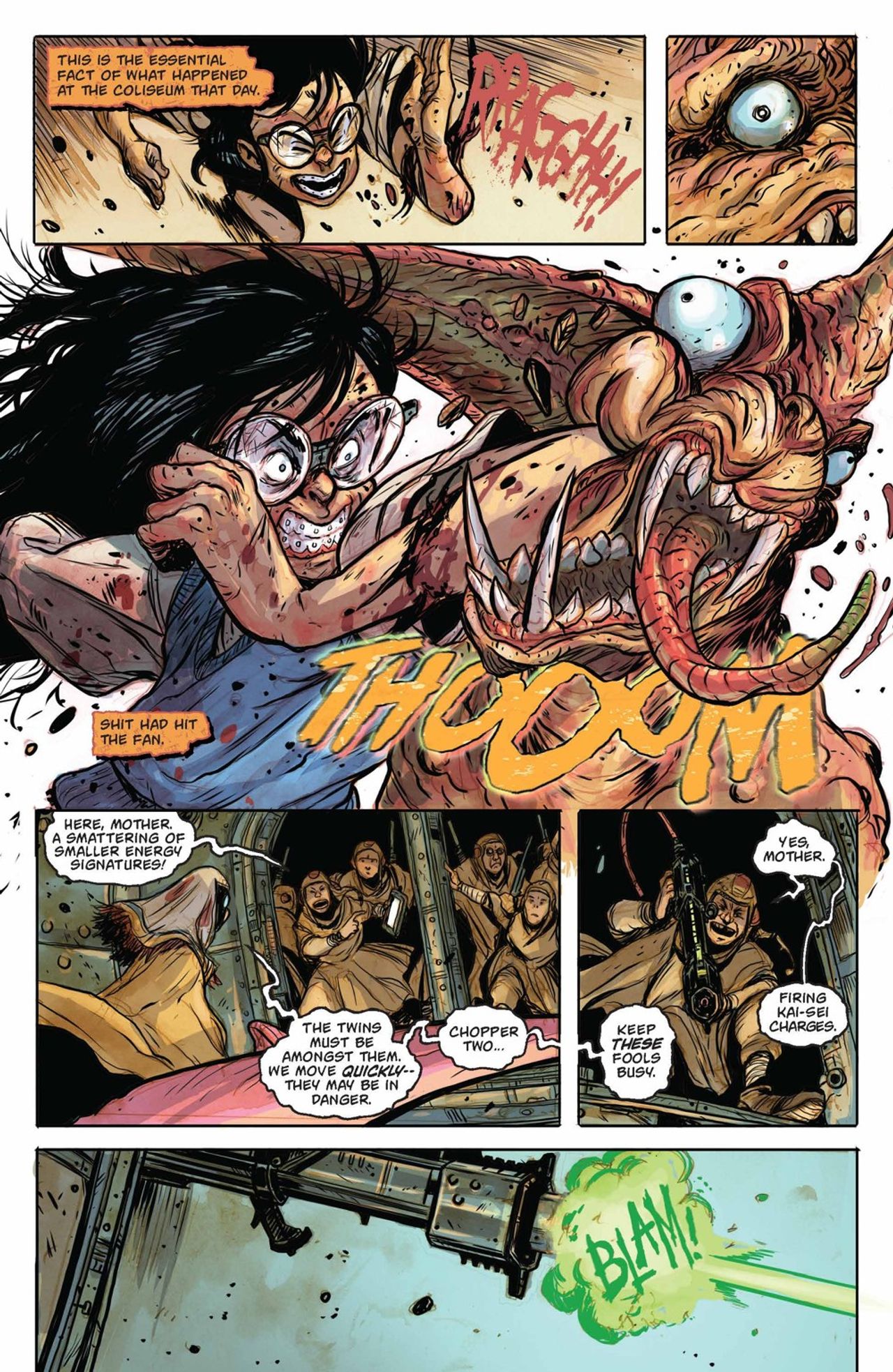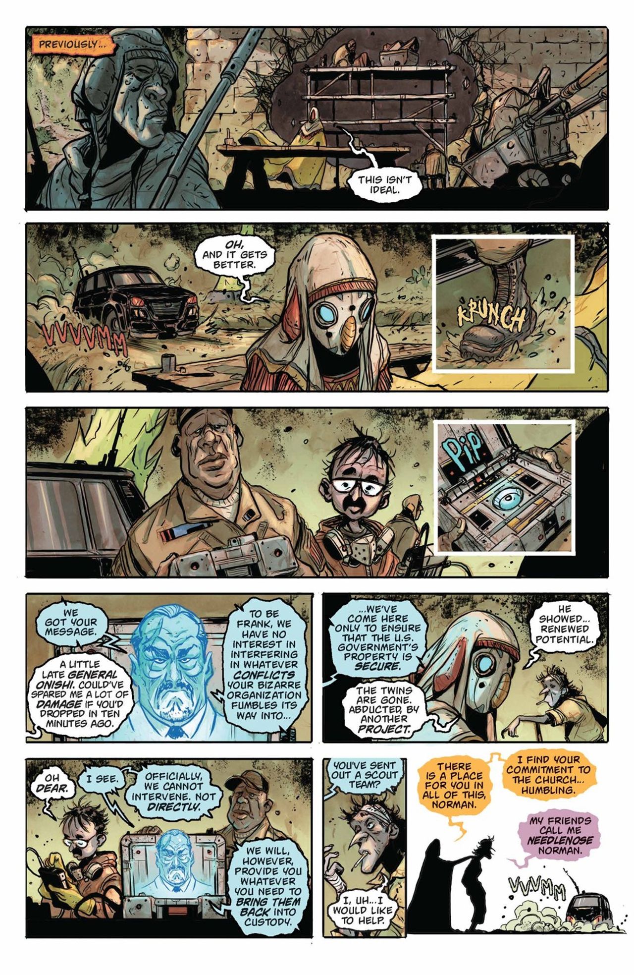Enter the Deadzone! The mysterious kai-sei infected wasteland the government would have you believe is uninhabited…but do you believe that? The Wanderer—a half-man, half-kaiju hybrid—is just about the only being brave enough to travel across this strange world. But as of late, he’s not traveling alone. He’s discovered two children with the ability to control kaiju!In this issue…Godzilla vs. the Wanderer! The return of the Church of Godzilla! Possibly even hints at the mysterious origins of our mysterious heroes?! Find out in the first-arc finale of Godzilla: Escape the Deadzone!