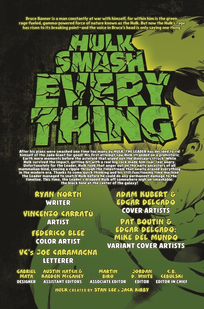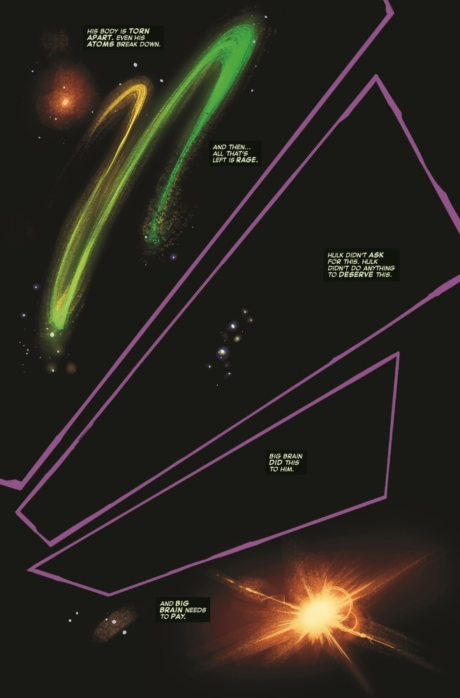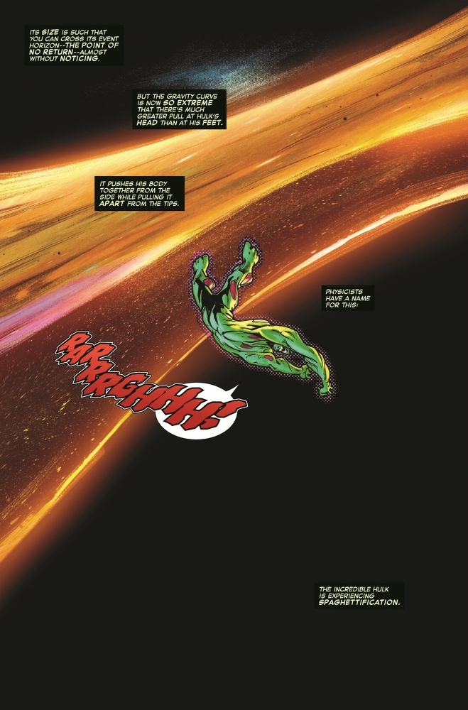 WHERE NO HULK HAS SMASHED BEFORE! It’s the fight you never knew you needed. HULK VS THE SUPERMASSIVE BLACK HOLE AT THE CENTER OF OUR GALAXY! Will the uncaring force of physics be enough to end Hulk’s rampage at last or will the Jade Giant conquer the cosmos itself?!
