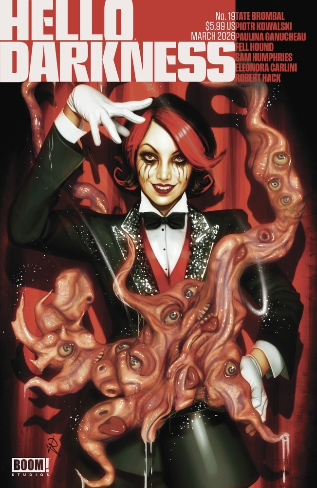 Stop and smell the corpses! The horrors of winter are behind us, but a sinister new season awaits… HELLO DARKNESS returns this spring with a fresh bouquet of horror! In “Freshly Maid,” a mousy young housekeeper comes face to face with a deathless evil. Vibrant visionary Paulina Ganucheau (Lemon Bird: Can Help!, She-Ra: Legend of the Fire Princess) delivers a chilling tale of innocence undone where the mess lurking in the shadows isn’t something you can simply sweep away. In “Imposter Syndrome,” a hapless suburbanite cascading into paranoia and mutilation. Innovative creators Tate Brombal (Black Hammer, The Oddly Pedestrian Life of Christopher Chaos) and Piotr Kowalski (Deadbox) team up for a 9-panel grid of terror! In “Cassie, Part II,” an all-girls softball team heads to the second inning with the forces of hell…and the bases are loaded! From the minds of Sam Humphries (The Legendary Star-Lord, Our Love Is Real) and Eleonora Carlini, every pitch turns into a plot twist. Join today’s top horror storytellers as they dive into the darkest corners of humanity!