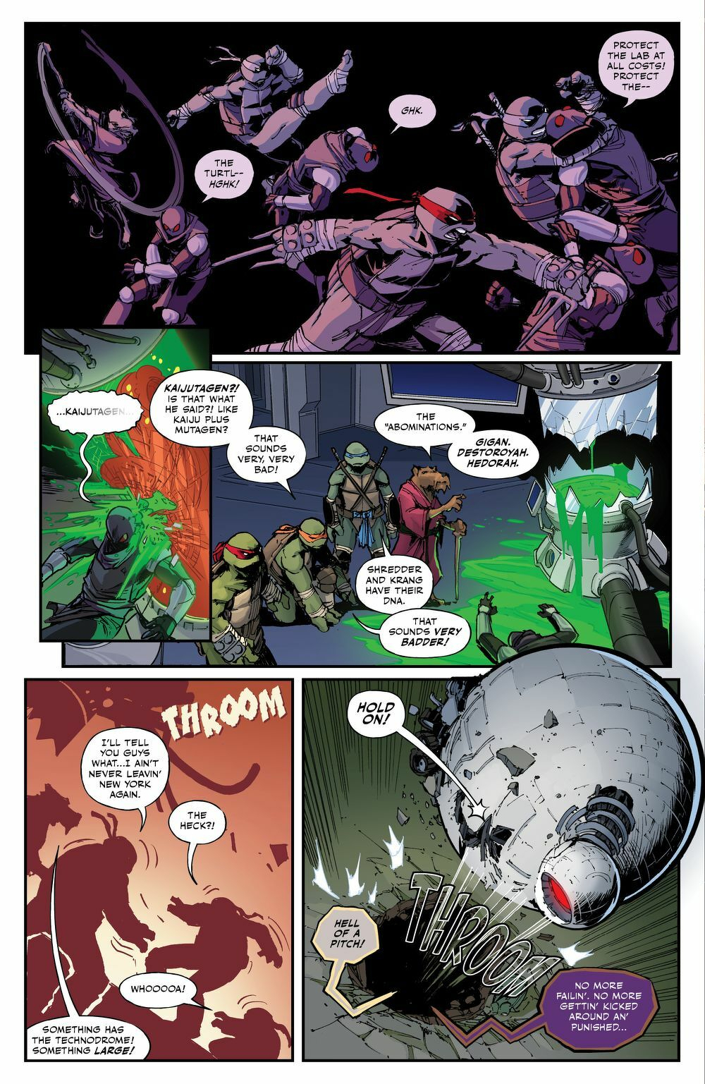 Time to meet the mashups. After using the mysterious Kaijutagen, Bebop and Rocksteady have been granted the powers and size of Gigan and Destoroyah, becoming…Gigbop and Rockstroyah! What can four little ninja turtles do against foes of this magnitude? Nothing. Thus, the Turtles will have no choice but to get big in Japan! Using the same Kaijutagen as their enemies, Leonardo, Raphael, and Michelangelo will grow into powerful new forms! Meet Leonardo’s Godzilla form, Raphael’s Rodan form, and Mikey’s King Ghidorah form!