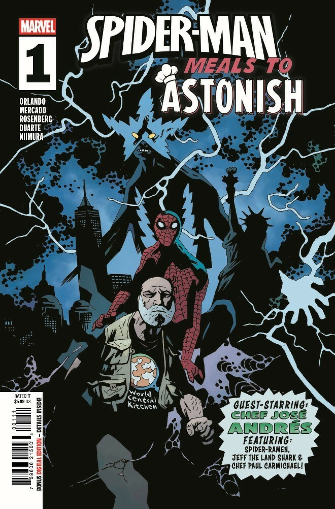 World-class chef, restaurateur, humanitarian, and educator José Andrés joins the Marvel Universe in SPIDER-MAN: MEALS TO ASTONISH #1. Peter Parker heads downtown to photograph the opening of world-class chef José Andrés' brand-new restaurant, but it’s crashed by Electro! The electric fiend came prepared for Spider-Man so José and World Central Kitchen chip in with Spidey to save the day—and everyone’s dinner! Also in this issue: JEFF’S TABLE debuts, featuring very special guest, Chef Paul Carmichael! That’s not all, this issue also collects the T.E.S.T. KITCHEN Infinity Comic in print for the first time, and an all-new SPIDER-RAMEN story!