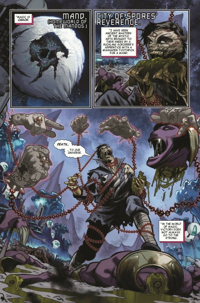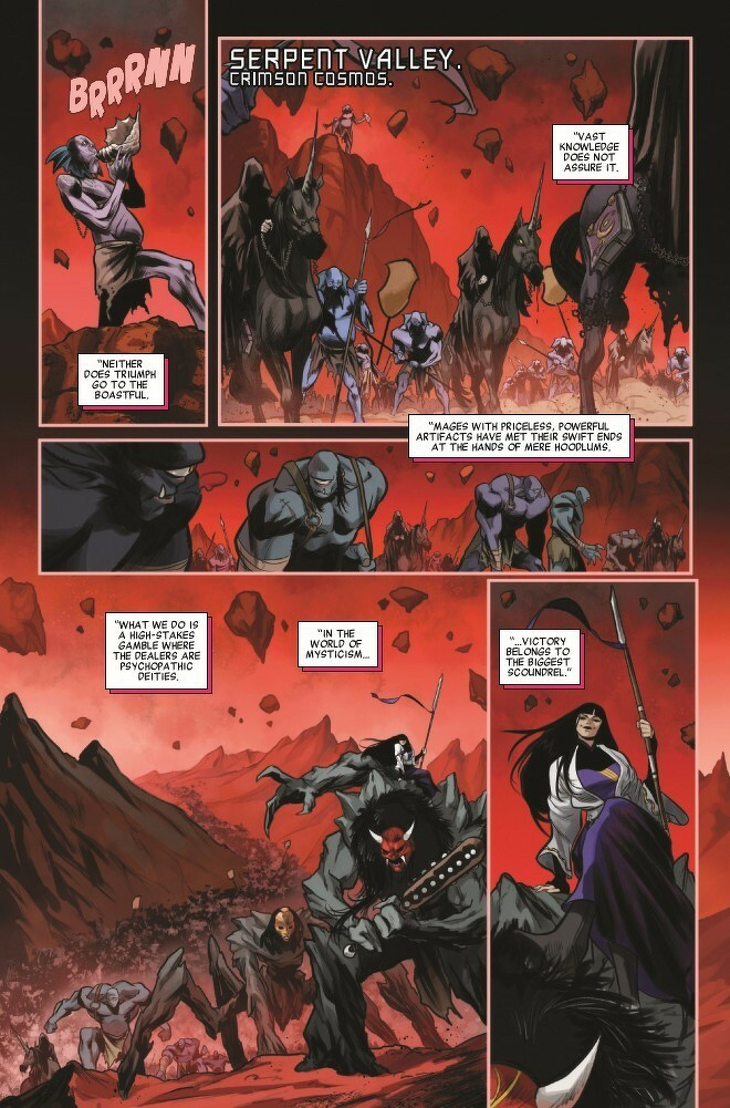 FIRST APPEARANCE OF GALACTA! The horns of war bellow battle formations. An army of mystics drenches the soil in blood sacrifices. STORM and SCARLET WITCH face impossible choices as an interdimensional invasion draws nearer. Will their friendship stand the test of imminent destruction, murder and bloodshed, or will it foster resentments? In all, the sweet embrace of DEATH tugs at the universe still. And making her long-awaited, first-ever comic book appearance is the Marvel 616 version of the femme inheritor of the Power Cosmic - blood of GALACTUS, the Devourer of Worlds…GALACTA.
