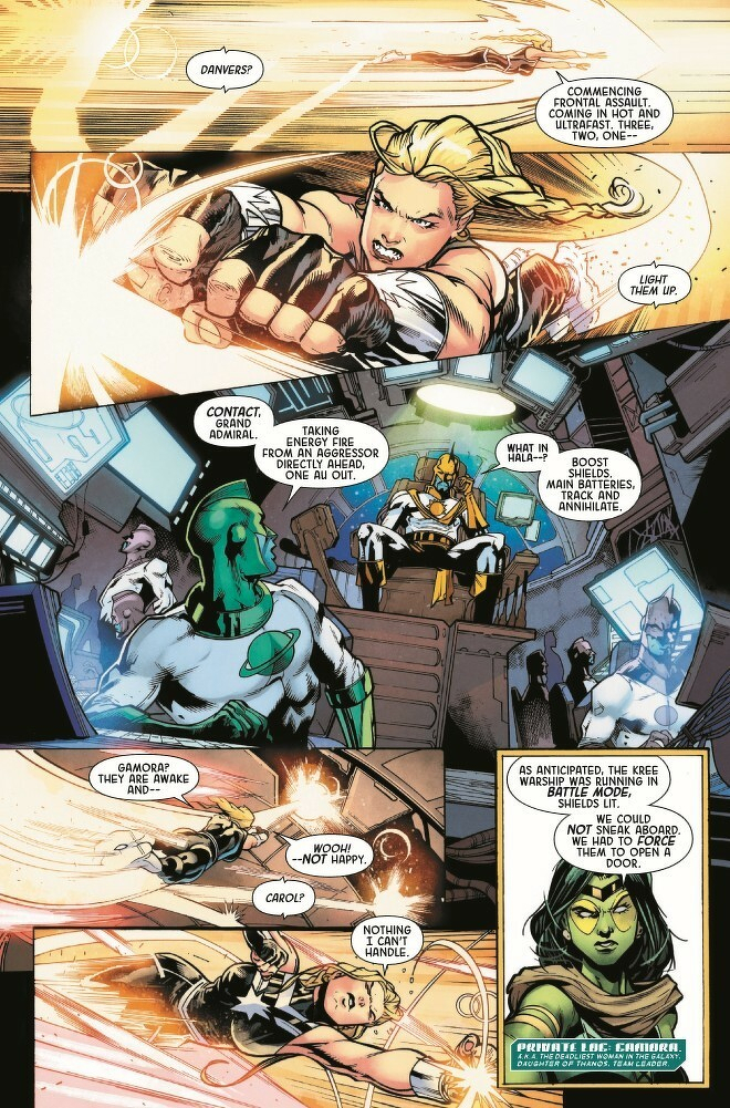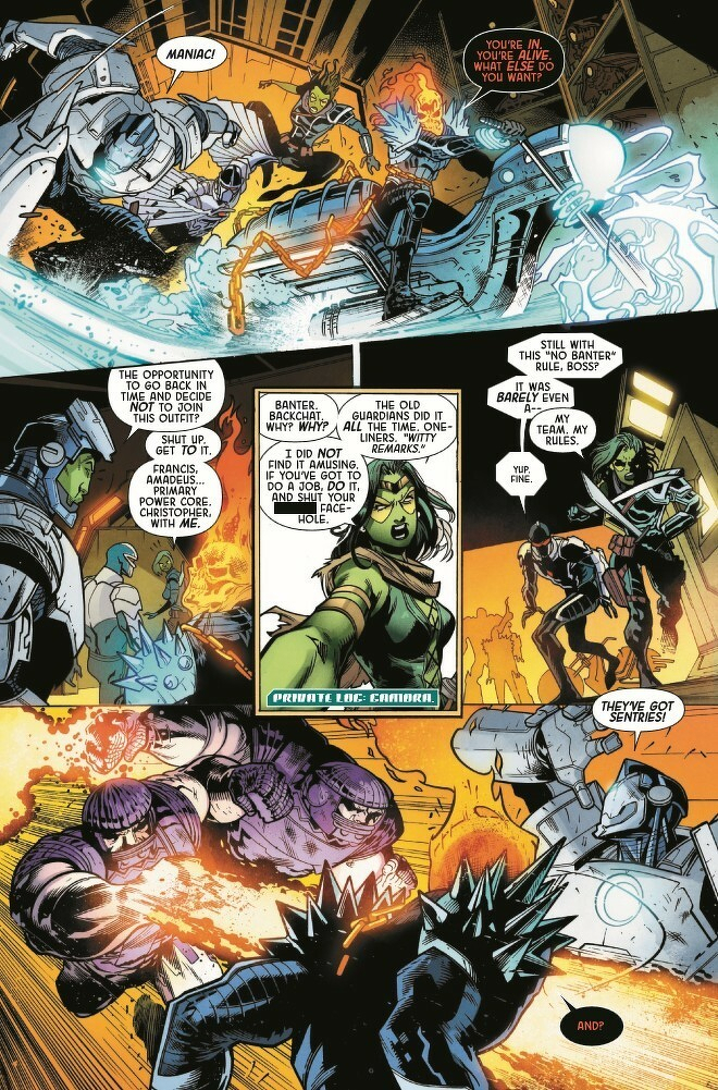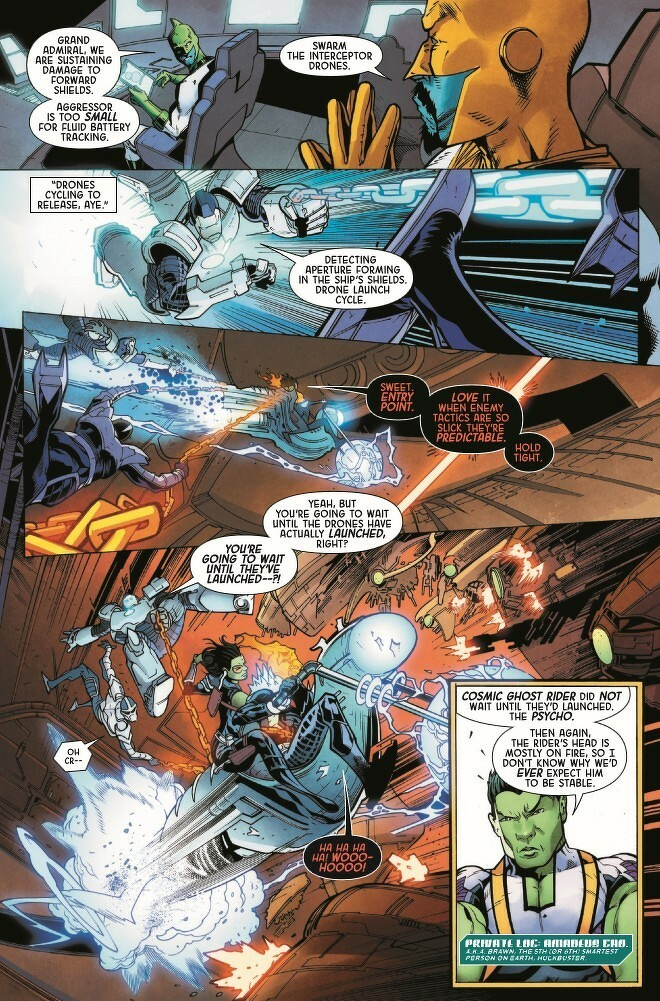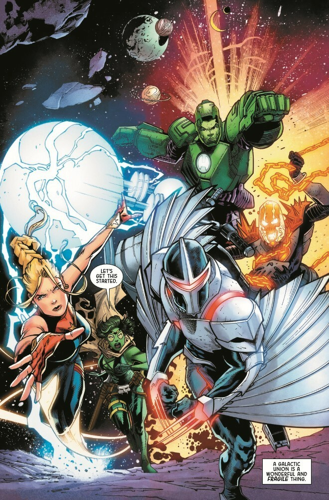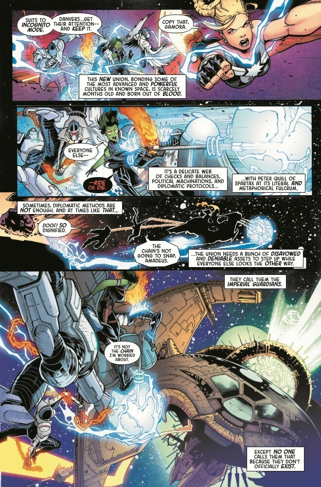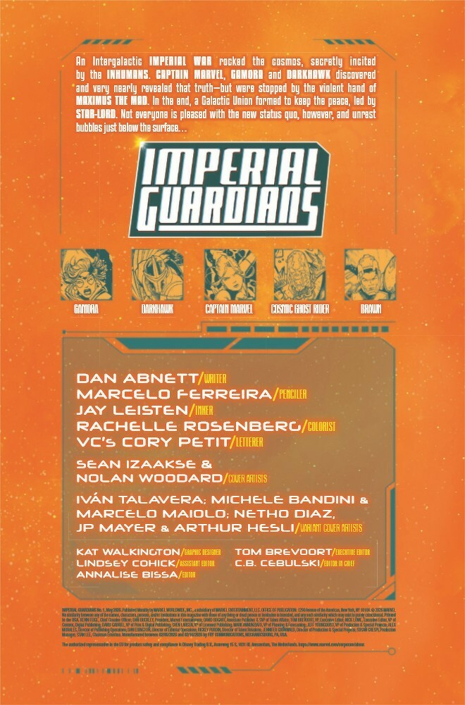 Gamora, Captain Marvel, Amadeus Cho, Darkhawk, Cosmic Ghost Rider! Five unlikely operatives recruited by Maximus of the Inhumans. Their mission? Protect the delicate balance of new Galactic Union by ANY means necessary…and failure is NOT an option. Expendable, deniable and disavowed, they are the Imperial Guardians. But can they do Maximus' dirty work and keep their consciences clean? Why has a Kree Grand Admiral gone rogue and attacked Hala? What’s going on with Darkhawk’s mind? What deluded fool thought COSMIC GHOST RIDER was a team player? And, most importantly…what kind of game is Maximus REALLY playing?