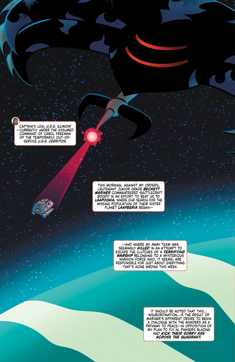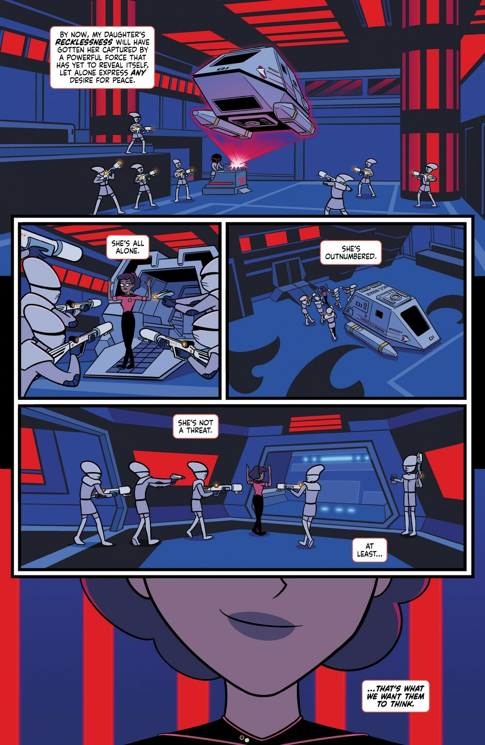 Captain Freeman and Mariner take the fight straight to the skies in the stolen U.S.S. Illinois, charging headlong into an old-school showdown against a mysterious wave of space invaders surrounding Laapoonia! Somewhere in the chaos, Boimler and his away team may be trapped—if they’re even still alive. But as the missing Laapeerians’ fate grows more uncertain and Starfleet closes in on its rogue crew, the clock is ticking faster than a falling pixel.Can the Lower Deckers outmaneuver both their enemies and their own command before it’s game over?Find out in this month’s explosive issue of Star Trek: Lower Decks!