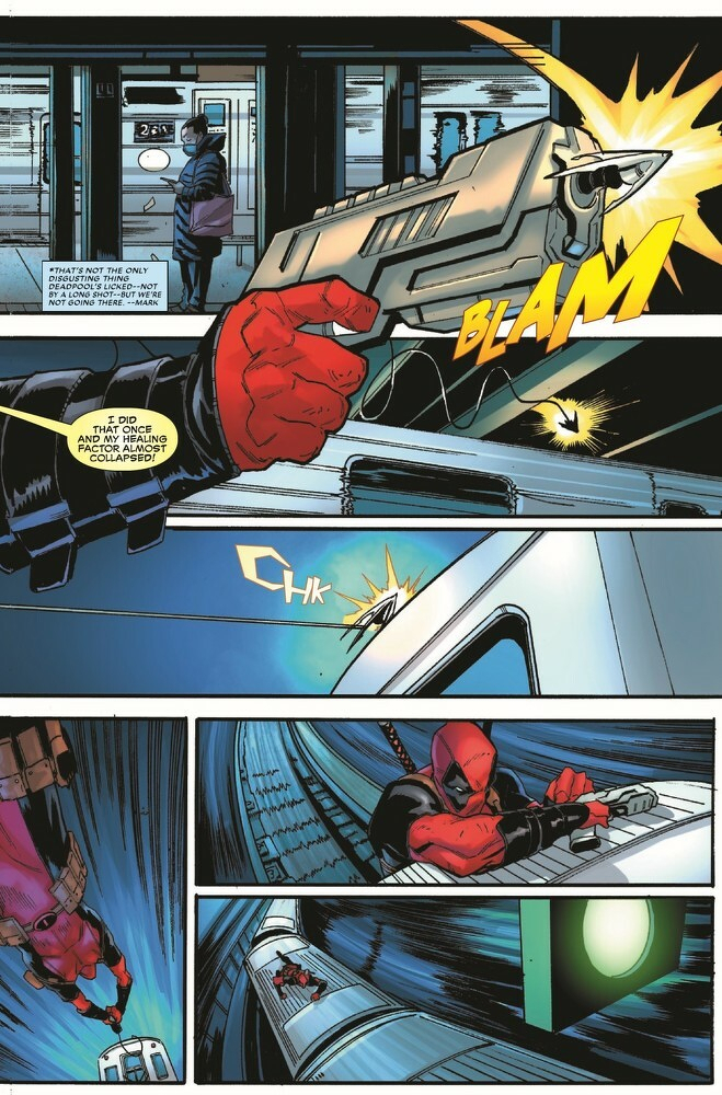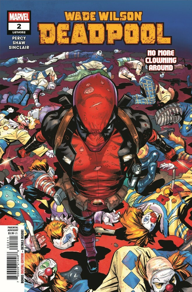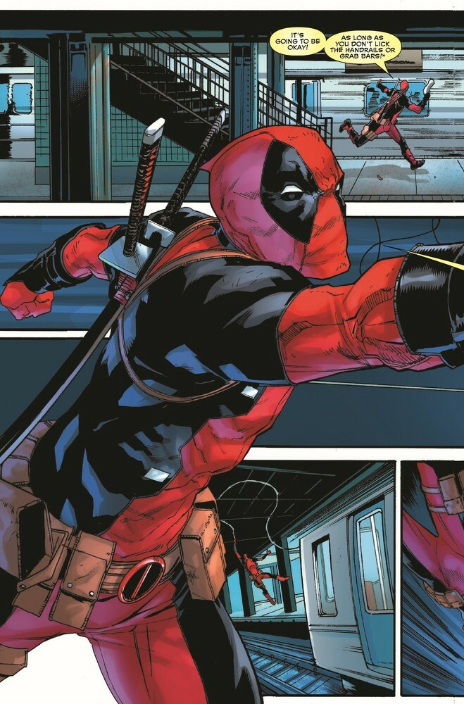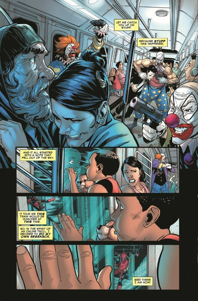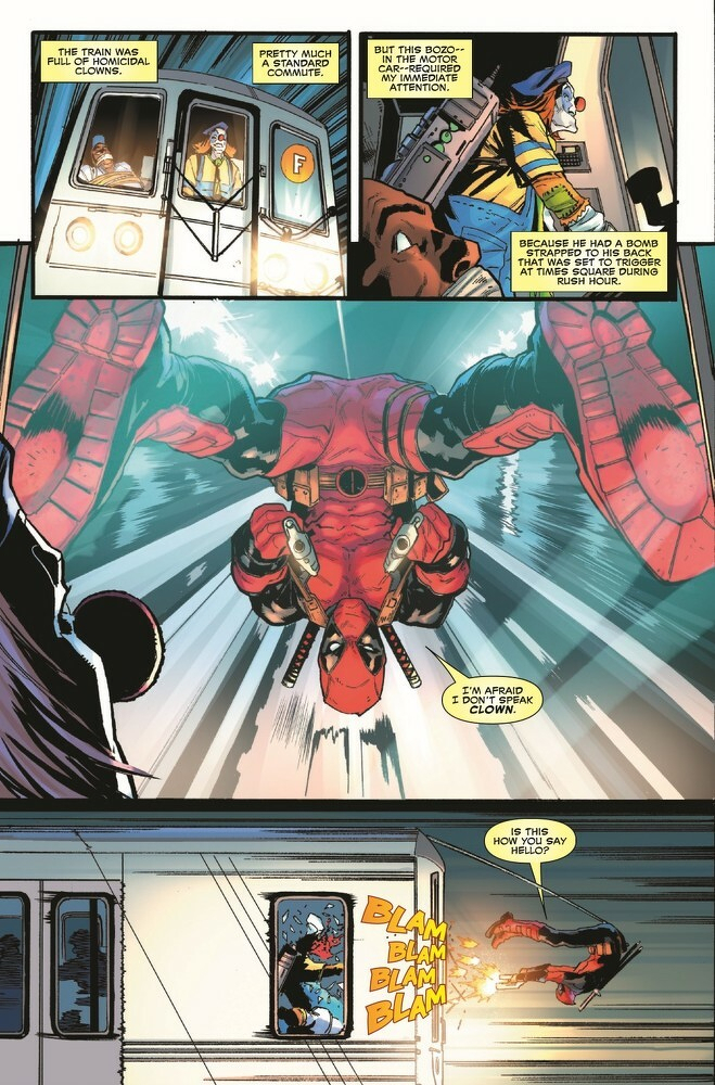 NO MORE CLOWNING AROUND! A deadly subway caper shows DEADPOOL the truth: The secret message he received was right! And with intel on crimes before they are committed, Wade Wilson has no choice but to do the right thing: exploit his insider knowledge for PROFIT and COLD HARD CASH! Merc’s gotta merc! But can he outrun the horrible pain of his tragic mistake, or is this all setting Wade up for the worst fall of his life? RATED PARENTAL ADVISORY.