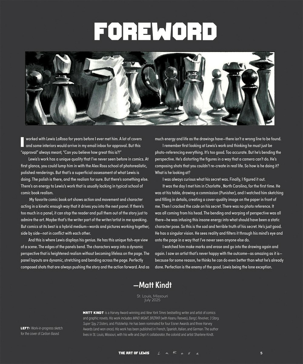 Since making his professional debut at the dawn of the 21st century, American illustrator Lewis LaRosa has defined himself as one of the most singular masters of the modern comic medium—fusing dynamic reference-based realism, stylized superhero storytelling, and a master’s control of shadow and light to produce a wholly unique, jaw-dropping style that could only be called “carbon based.” In this first-ever career retrospective—spanning over 250 pages of LaRosa’s raw, unexpurgated line art in all of its painstakingly rendered intensity, alongside rarely seen character designs, concepts, and more from Marvel Comics, Valiant Entertainment, Epic Games, BOOM! Studios, Hasbro, Creative Beast Studio, and more—experience the artist’s artistic evolution in all of its stunning detail from series including Bloodshot Reborn, Divinity, Punisher MAX, Savage, Transformers, and more. CARBON BASED: THE ART OF LEWIS LAROSA will feature an all-new introduction by Oni Press president and publisher Hunter Gorinson with page-by-by commentary by LaRosa and former Valiant editor in chief Warren Simons, and appreciations by some of the artist’s most prominent colleagues and collaborators, including Lee Bermejo, Dave Johnson, Matt Kindt, Jeff Lemire, Yanick Paquette, and more.