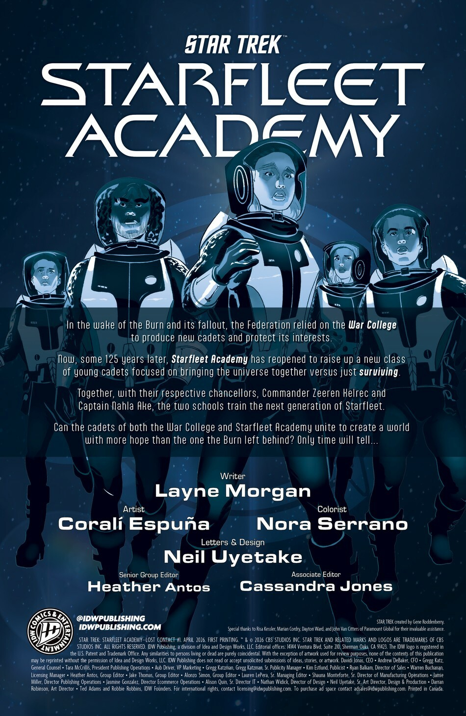 Join us for a brand-new adventure featuring cadets from Paramount’s Starfleet Academy, streaming January 2026! Caleb, Genesis, Jay-Den, Kyle, and Tarima are all students of Starfleet Academy, the illustrious school responsible for the Federation’s best. One day, they dream to serve as great leaders on board ships of their own, to study the cultural intricacies of sentient life amongst the Galaxy, or to go where no person has explored before. But today, their mission is simply to execute a survey simulation on a low-oxygen, lifeless planet. Or at least, it seems simple…until a huge storm cuts off their contact with their teachers aboard the Athena…something impossible appears: an alien. Now, they’ll have to work together and use everything they’ve learned in class about first contact to make it off the planet alive!