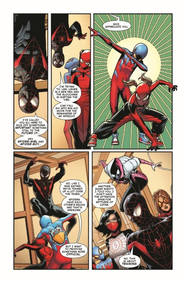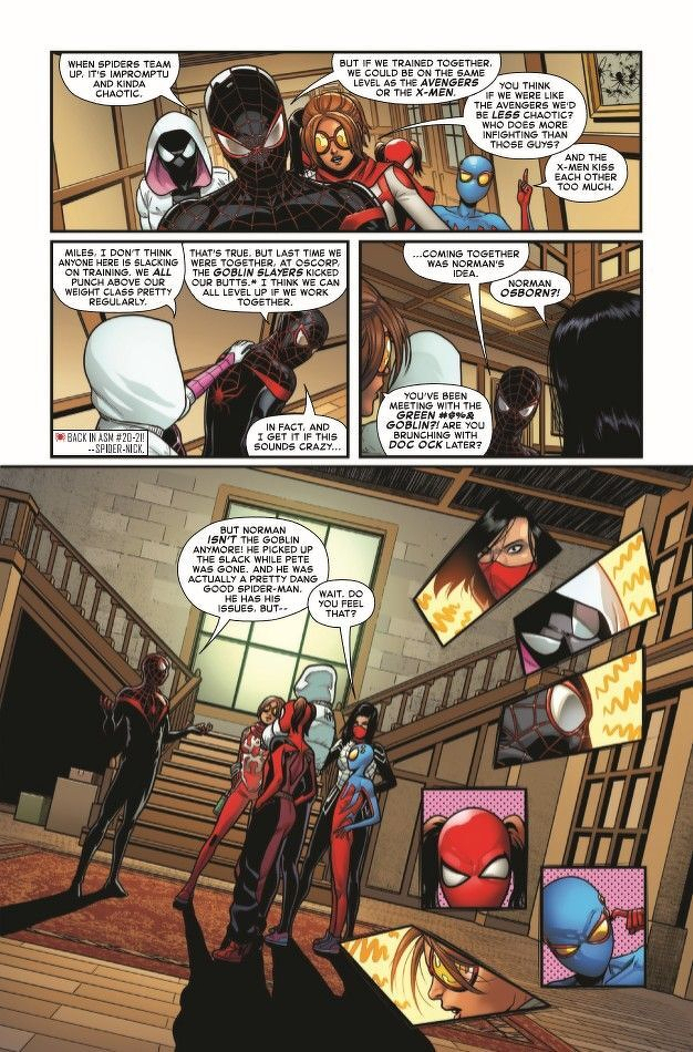 LEARNING TO CRAWL! Miles Morales, Spider-Gwen, Silk, Araña, Spider-Boy and Spider-Girl have one thing in common - THEY AREN’T READY. According to former Resolute Spider-Man NORMAN OSBORN. So he and Spider-Woman are going to TRAIN THEM to meet the next threat - the only way the Green Goblin knows how. Because the next threat might well BE the Green Goblin!