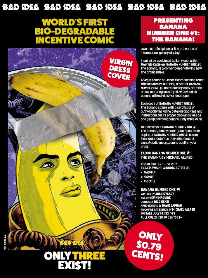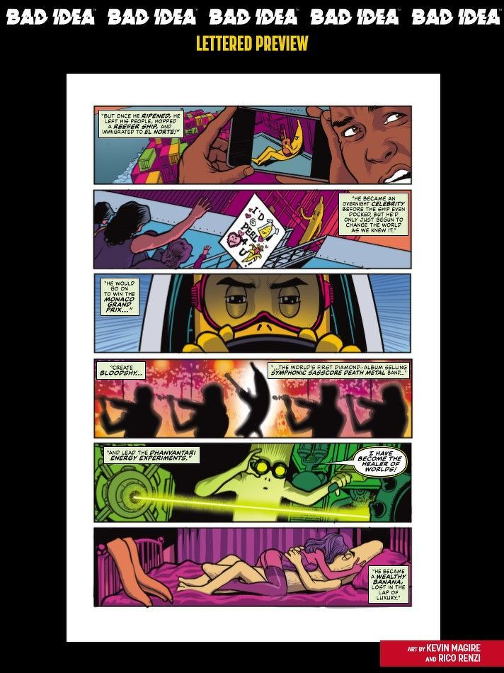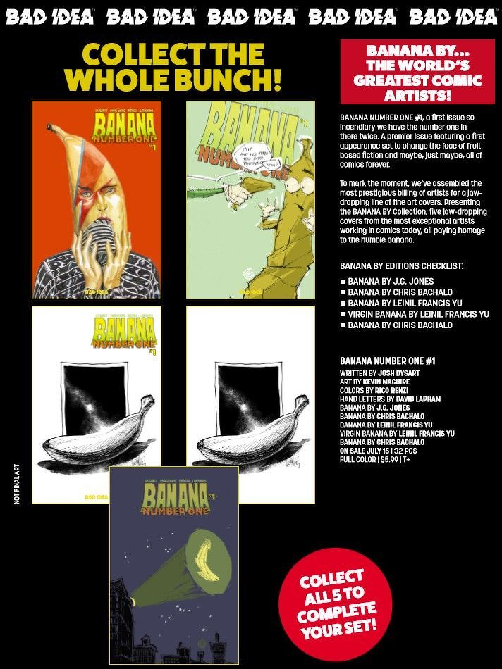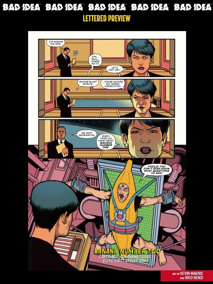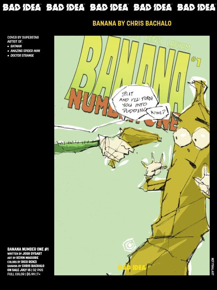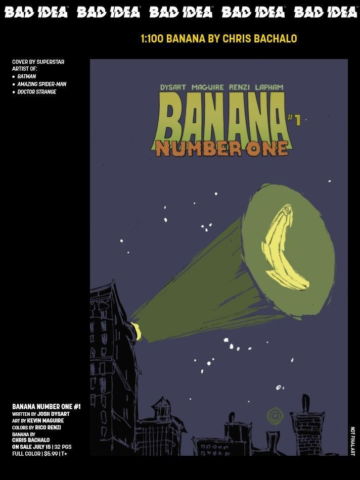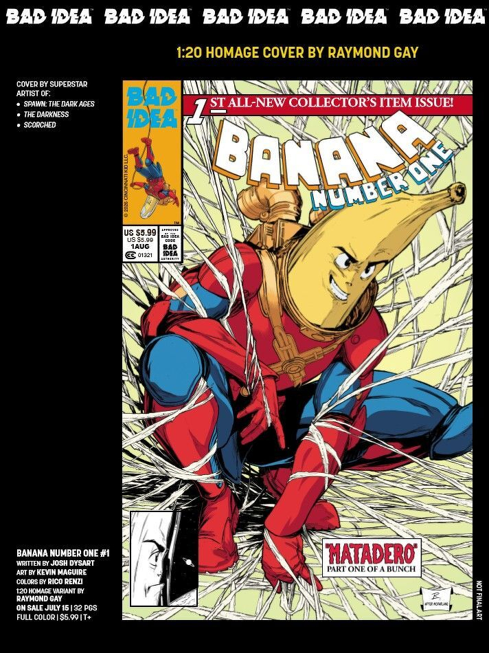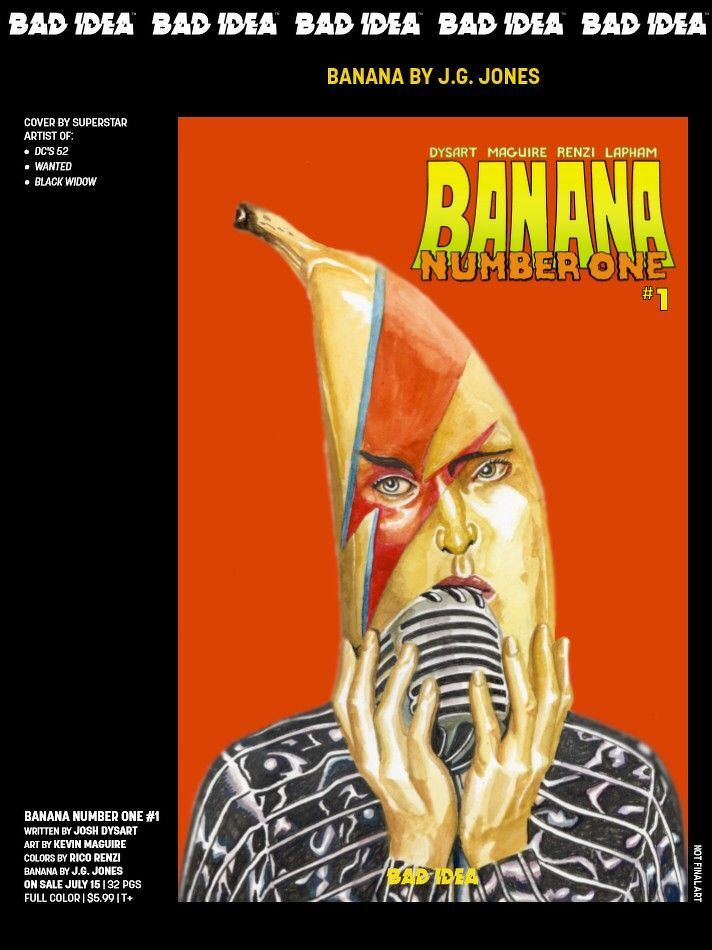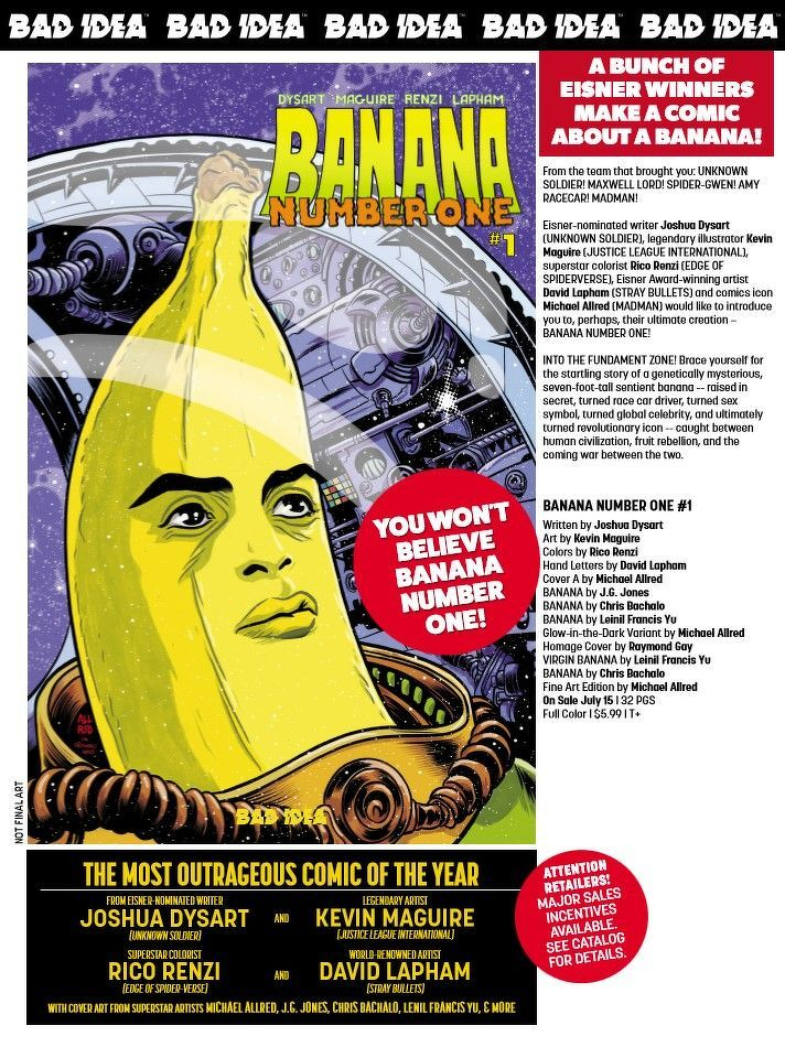 Eisner-nominated writer Joshua Dysart (UNKNOWN SOLDIER), legendary illustrator Kevin Maguire (JUSTICE LEAGUE INTERNATIONAL), superstar colorist Rico Renzi (EDGE OF SPIDERVERSE), Eisner Award-winning artist David Lapham (STRAY BULLETS) and comics icon Michael Allred (MADMAN) would like to introduce you to, perhaps, their ultimate creation with -- BANANA NUMBER ONE!