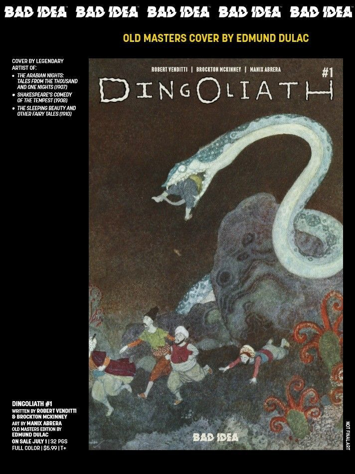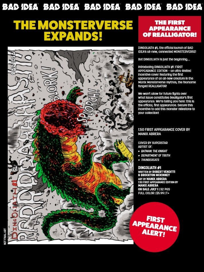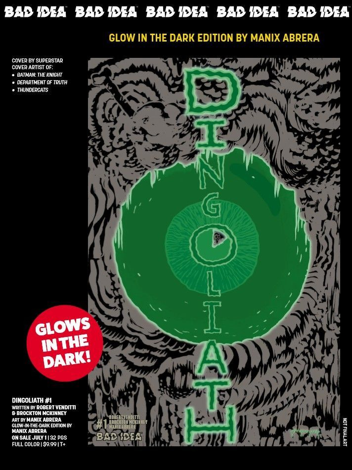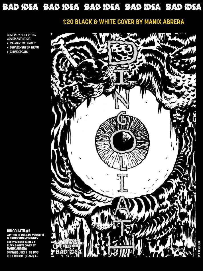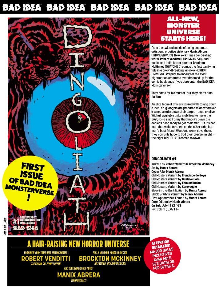 PLUS, from the twisted minds of superstar artist Manix Abrera (THUNDERCATS), New York Times best-selling writer Robert Venditti (SUPERMAN ‘78), and acclaimed indie horror director Brockton McKinney (REPTCHILD) comes the first terrifying tale in a groundbreaking, all-new HORROR UNIVERSE in -- DINGOLIATH.