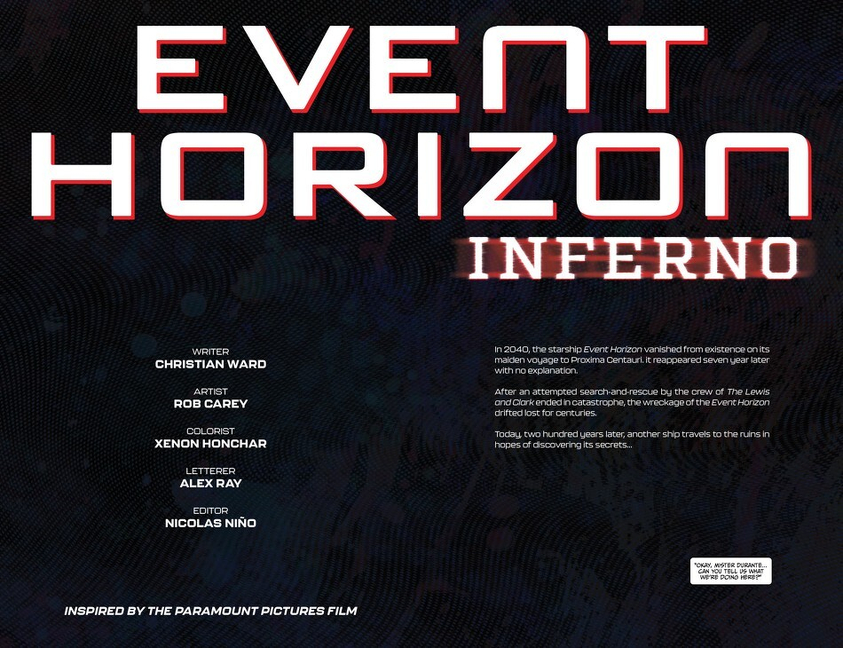 Miniseries premiere! New jumping-on point! It’s Aliens meets Dante’s Inferno! Space marines clash with demons aboard the Event Horizon in this follow-up to the biggest horror comic of 2025! In 2040, the starship Event Horizon disappeared. Seven years later, it returned possessed by a demonic entity. After murdering its rescue crew, it was blown in half, with the front of the ship left yearning for its heart: a gravity drive designed for interdimensional travel. Two hundred years later, a billionaire brings his own private star fleet to the wreckage around Neptune. He’s heard stories of the Event Horizon and will gleefully sacrifice any number of employees to uncover its secrets! Christian Ward (Event Horizon: Dark Descent, Two-Face) returns to the Event Horizon, joined by superstar sci-fi artist Rob Carey (Outsiders, Aliens: Resistance) to tell another story spun out of the cult-classic film! Hell is only a word. The reality is much, much worse.