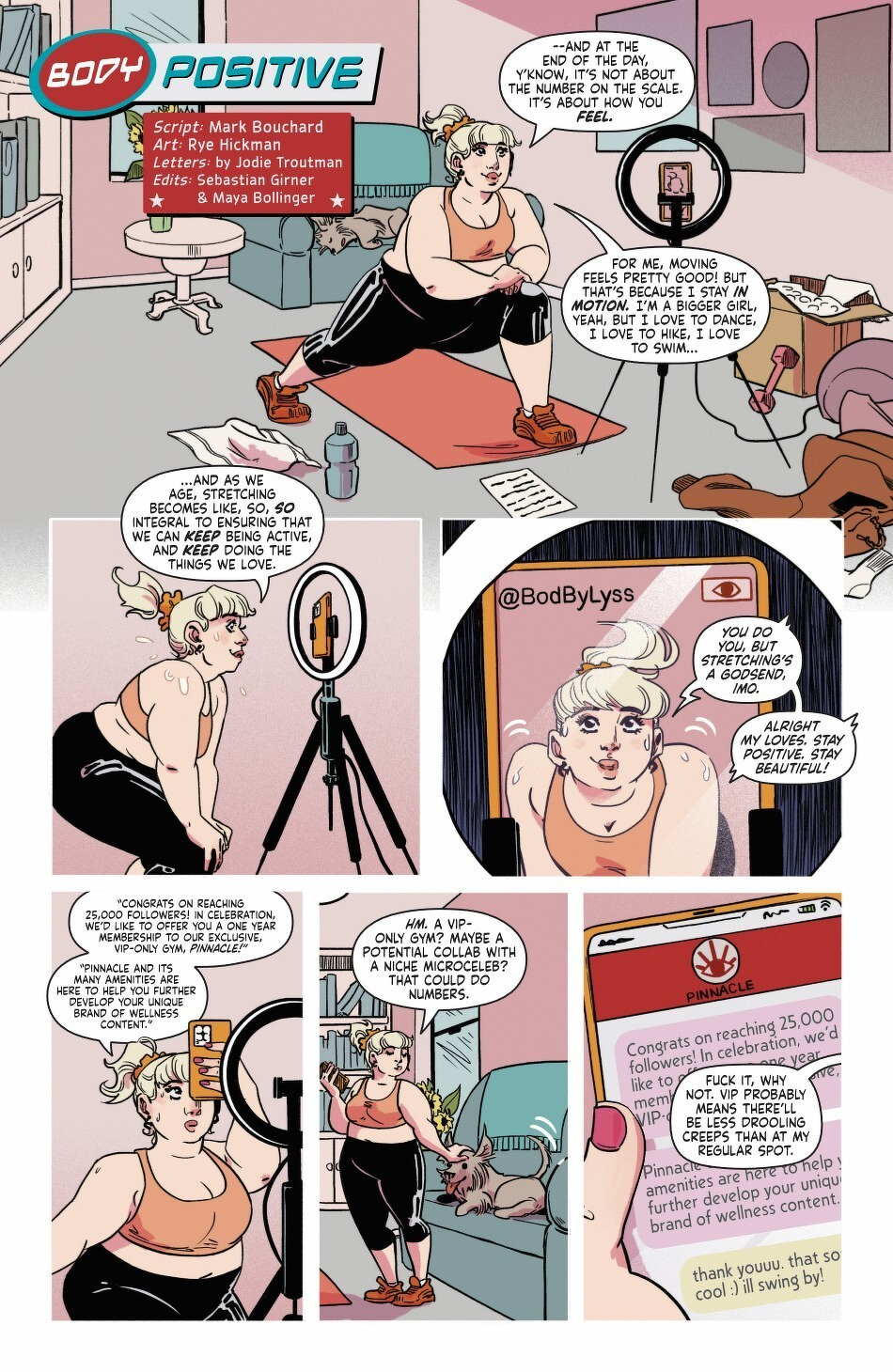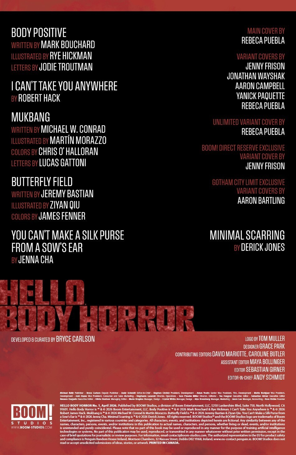 New forms of fear are bursting onto the scene with this newest curation of jaw-breaking talent!Test your nerves and prove your guts with the grossest, squishiest, gruesomest comics in… Hello Body Horror, a fresh collection of spine-cracking tales and stomach-churning terrors!In “Body Positive” by Mark Bouchard and Rye Hickman, a fitness influencer striving for greatness has her mind go where her body cannot follow…yet.In “Minimal Scarring” by indie sensation Derick Jones, a plastic surgeon who caters to the ultra-rich uses what pieces they leave behind to transform himself.Also featuring stories by Michael W. Conrad, Martín Morazzo, Jeremy Bastian, Ziyan Qiu, Jenna Cha, and Robert Hack for a veritable “Who’s Who” in “Kill U Comics!”