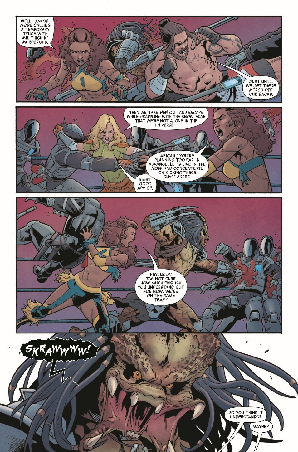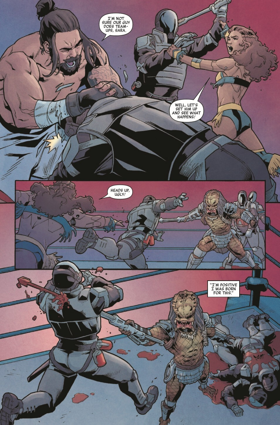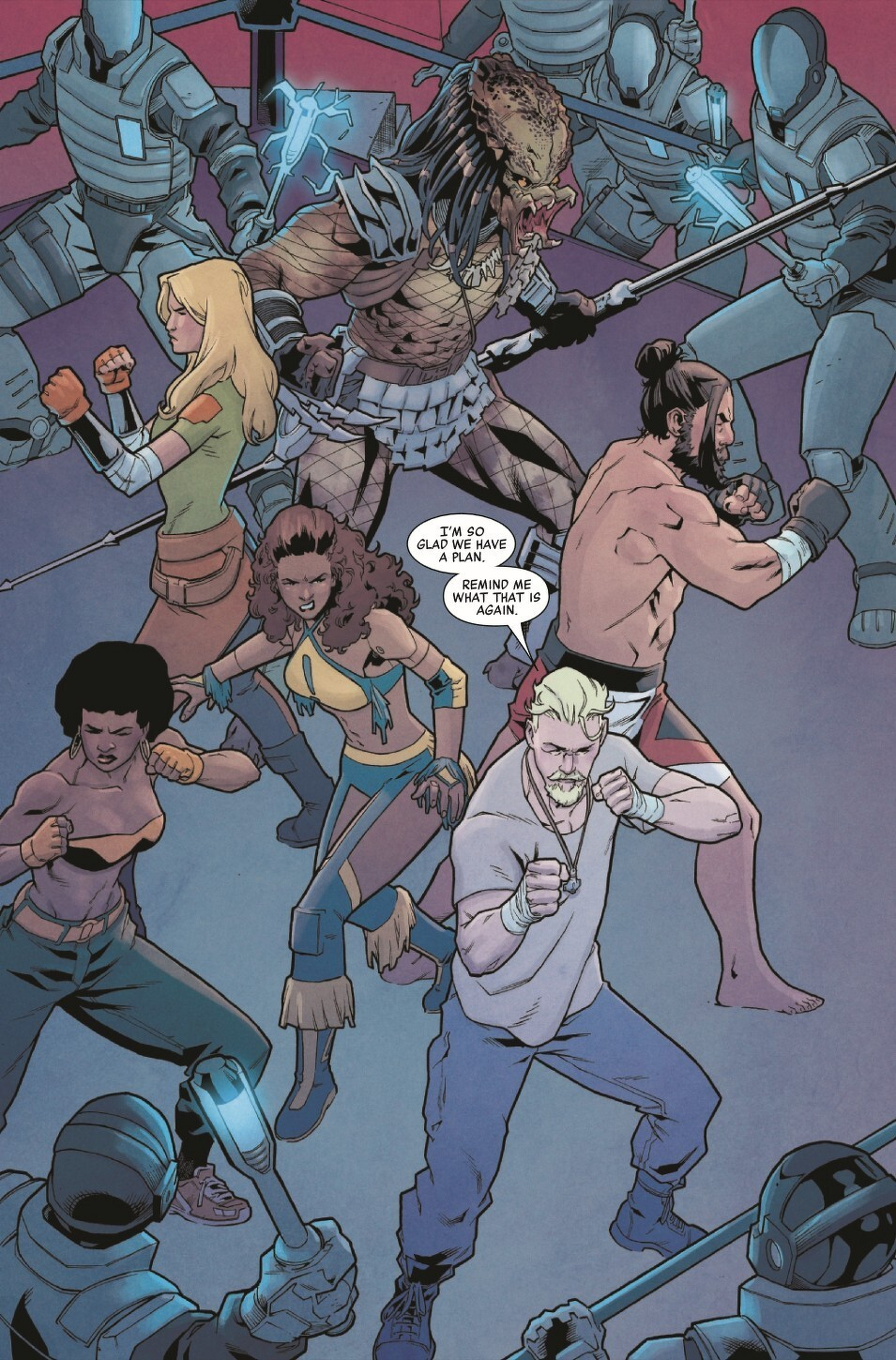 With the arrival of an alien Predator, a tournament of the world’s top fighters has turned into a desperate bid to stay alive! The human survivors are trapped within the arena and the Predator is hunting them one by one. Can they rally to overcome not only their alien enemy but also the all-too-human forces keeping them confined? And who is the traitor in their midst? RATED PARENTAL ADVISORY.